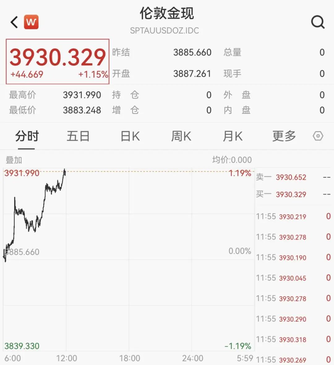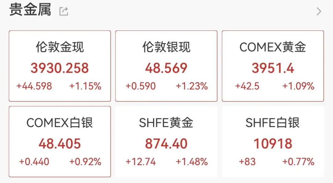 消息面上,现货黄金持续拉升,日内涨幅达1.15%,报3931美元/盎司,刷新历史新高;COMEX黄金期货主力最新报3951.4美元/盎司,日内涨1.09%;现货白银日内涨幅达1.23%,现报48.57美元/盎司。