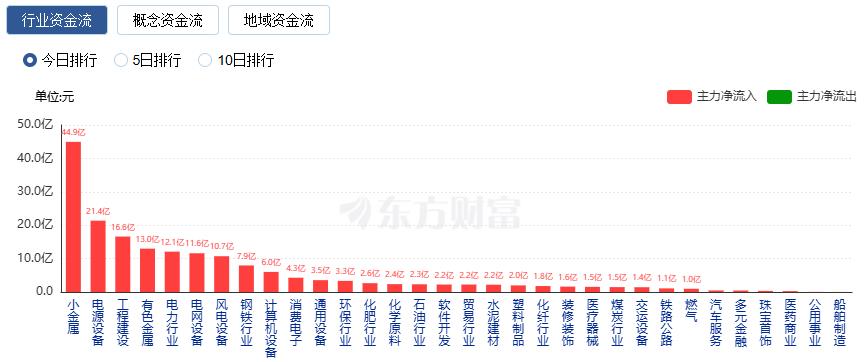 行业资金方面,截至收盘,小金属、电源设备、工程建设等净流入排名靠前,其中小金属净流入44.95亿。
