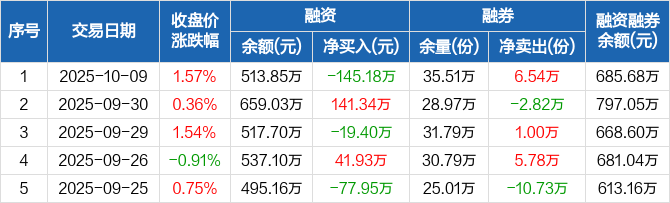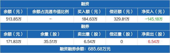融资方面,当日融资买入184.63万元,融资偿还329.81万元,融资净偿还145.18万元。融券方面,融券卖出6.54万份,融券偿还0份,融券余量35.51万份,融券余额171.83万元。融资融券余额合计685.68万元。