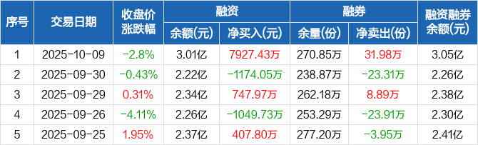 融资方面,当日融资买入1.31亿元,融资偿还5146.45万元,融资净买入7927.43万元,净买入额创历史新高。融券方面,融券卖出43万份,融券偿还11.02万份,融券余量270.85万份,融券余额422.8万元。融资融券余额合计3.05亿元。