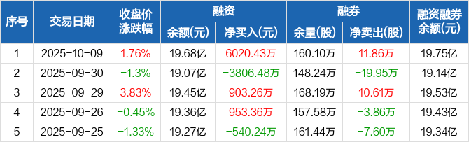 融资方面,当日融资买入1.69亿元,融资偿还1.09亿元,融资净买入6020.43万元。融券方面,融券卖出12.45万股,融券偿还5900股,融券余量160.1万股,融券余额741.26万元。融资融券余额合计19.75亿元。