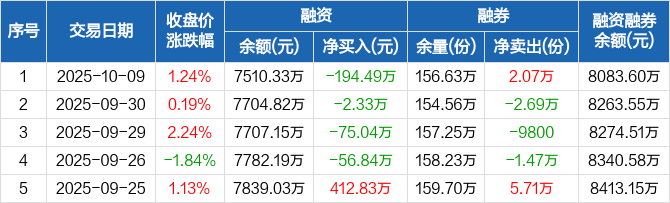 融资方面,当日融资买入534.97万元,融资偿还729.46万元,融资净偿还194.49万元,连续4日净偿还累计328.7万元。融券方面,融券卖出4.65万份,融券偿还2.58万份,融券余量156.63万份,融券余额573.27万元。融资融券余额合计8083.6万元。