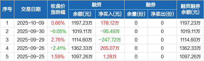 融资方面,当日融资买入412.38万元,融资偿还234.26万元,融资净买入178.12万元。融券方面,融券卖出0份,融券偿还0份,融券余量0份,融券余额0元。融资融券余额合计1197.23万元。