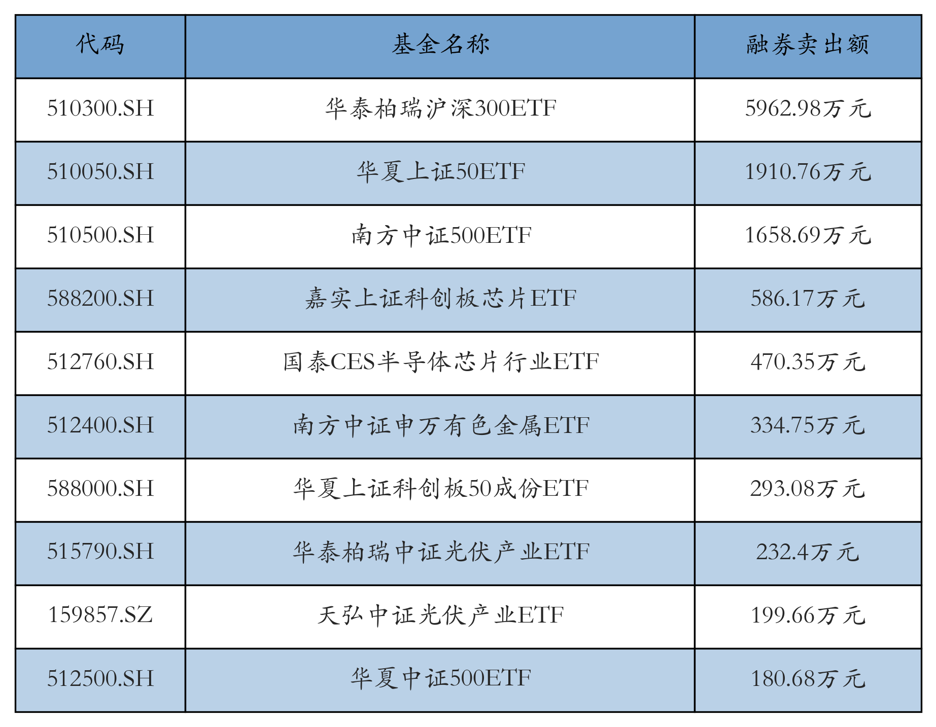 10月9日ETF融券卖出额前三位分别为:华泰柏瑞沪深300ETF(5962.98万元)、华夏上证50ETF(1910.76万元)和南方中证500ETF(1658.69万元),前10具体见下表: