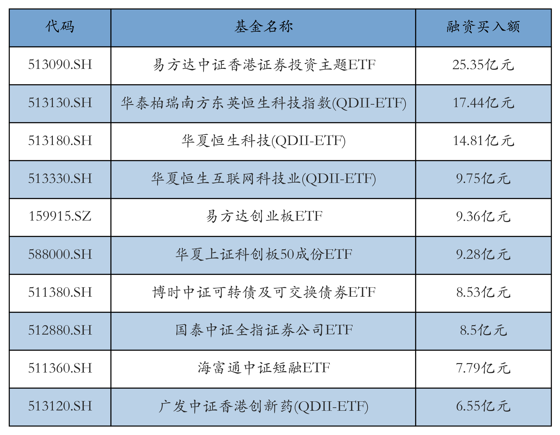 10月9日ETF融资买入额前三位分别为:易方达中证香港证券投资主题ETF(25.35亿元)、华泰柏瑞南方东英恒生科技指数(QDII-ETF)(17.44亿元)和华夏恒生科技(QDII-ETF)(14.81亿元),前10具体见下表: