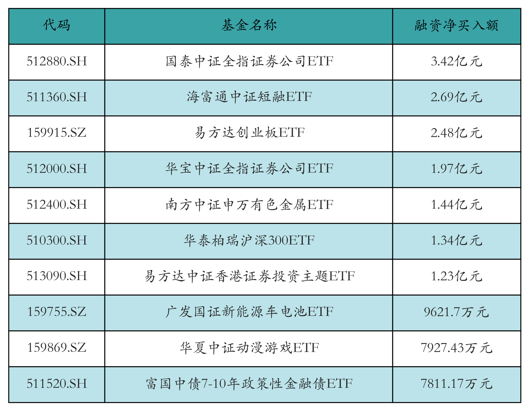 10月9日ETF融资净买入额前三位分别为:国泰中证全指证券公司ETF(3.42亿元)、海富通中证短融ETF(2.69亿元)和易方达创业板ETF(2.48亿元),前10具体见下表:
