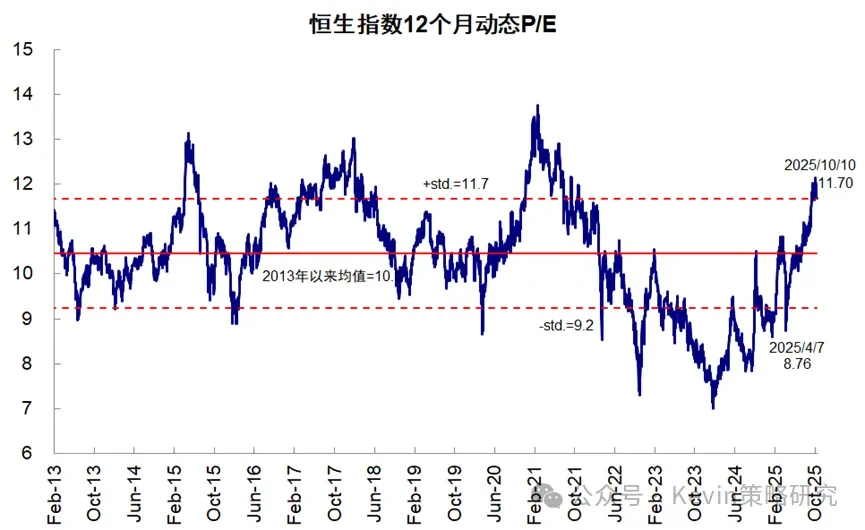 整体指数估值也是类似,标普500指数当前21倍,去年底高点22,对等关税前20.5倍,对等关税后最低点18倍;恒指当前11.7倍,对等关税前高点10.8,对等关税后低点8.8倍。