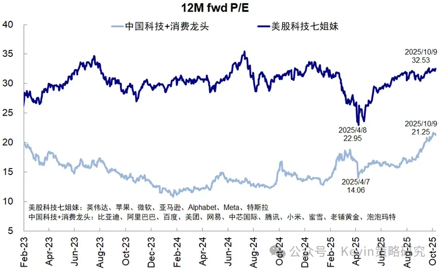 第五,市场所处的位置不同。中美两地市场都已经有很多浮盈,且估值高于当时,但中国市场高出更多。美股尤其是七姐妹从2月DeepSeek异军突起“打破”美国AI一枝独秀地位后就已经开始回调。目前,美股“七姐妹”目前估值31倍左右,依然低于去年底今年初的高点33.7,4月对等关税前是26.8,大跌后低点23;中国科技与消费龙头当前的估值是20倍左右,高于3月底对等关税前高点的18.8,对等关税后的低点是14倍。