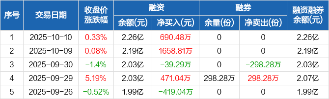 融资方面,当日融资买入3619.12万元,融资偿还2928.64万元,融资净买入690.48万元。融券方面,融券卖出0份,融券偿还0份,融券余量0份,融券余额0元。融资融券余额合计2.26亿元。
