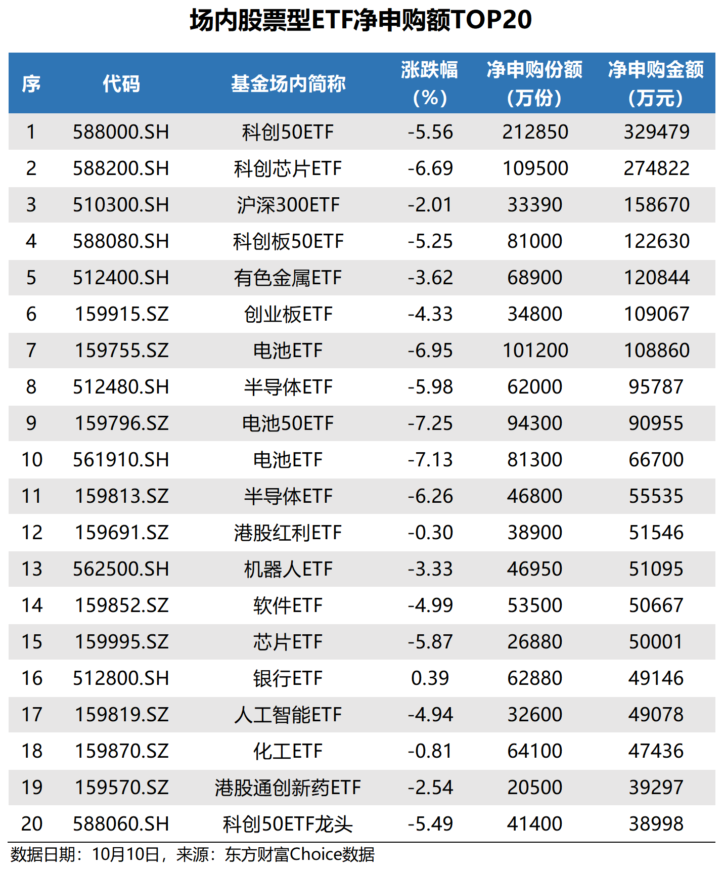 上周五,净申购金额最多的为科创50ETF,净申购金额为32.95亿元。此外,科创芯片ETF和沪深300ETF也获购居前,净申购金额依次为27.48亿元和15.87亿元。