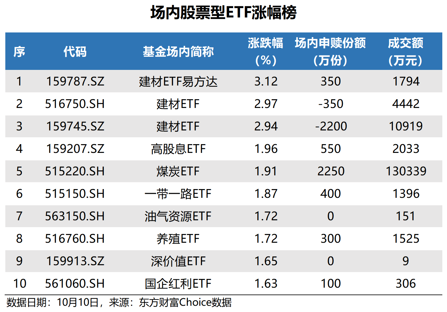数据显示,上周五场内股票型ETF中,建材ETF易方达、建材ETF(516750.SH)、建材ETF(159745.SZ)涨幅居前。其中,建材ETF易方达涨幅最大,为3.12%。