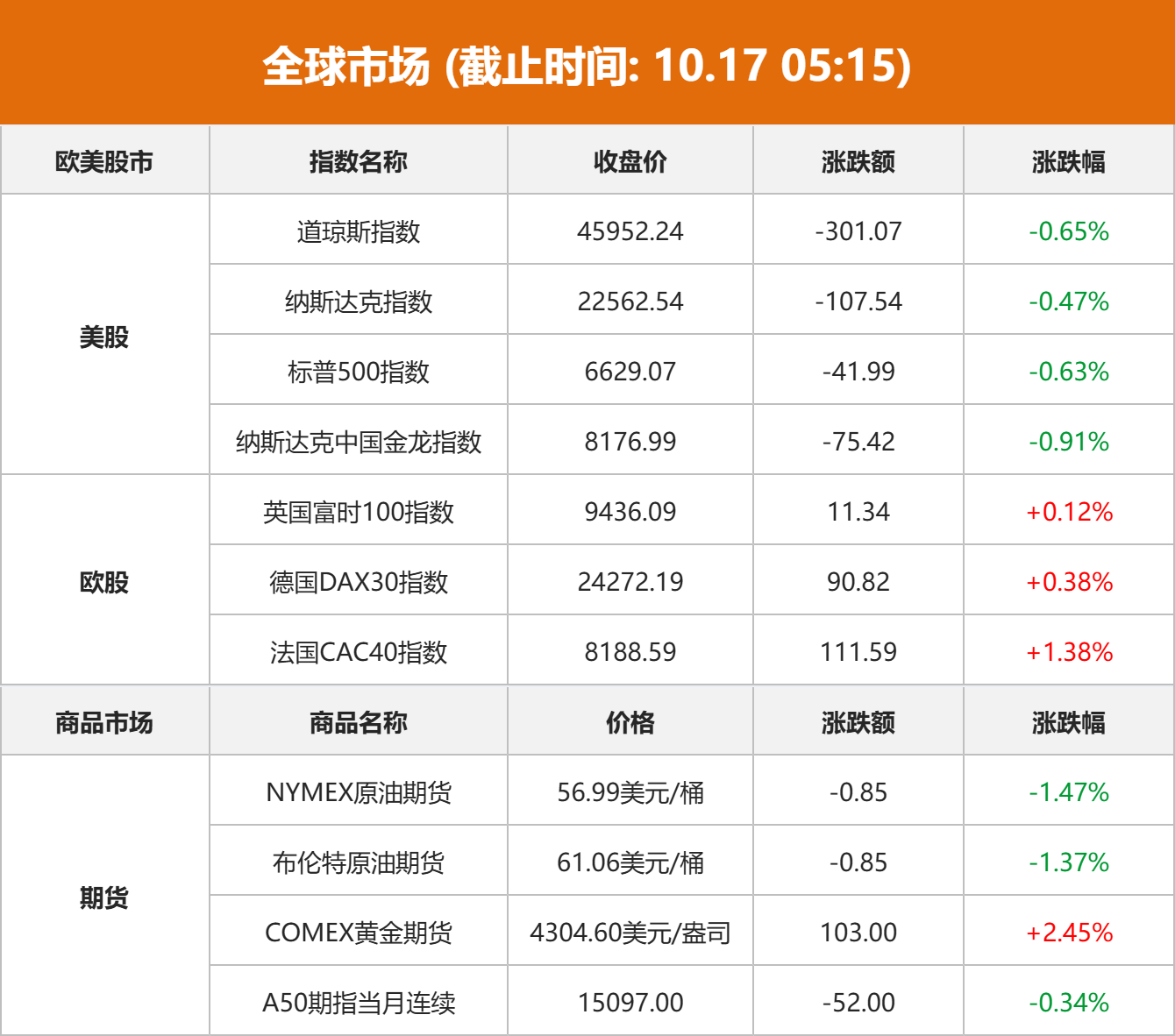 美股市场:美股三大指数10月16日收盘全线下跌。截至收盘,道琼斯工业平均指数比前一交易日下跌301.07点,收于45952.24点,跌幅为0.65%;标准普尔500种股票指数下跌41.99点,收于6629.07点,跌幅为0.63%;纳斯达克综合指数下跌107.54点,收于22562.54点,跌幅为0.47%。