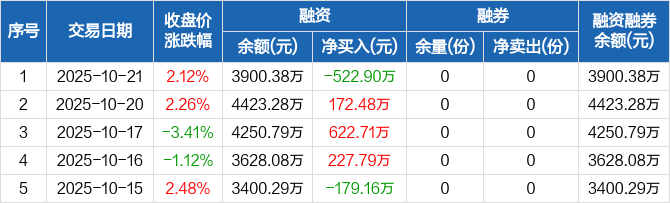 融资方面,当日融资买入846.02万元,融资偿还1368.91万元,融资净偿还522.9万元。融券方面,融券卖出0份,融券偿还0份,融券余量0份,融券余额0元。融资融券余额合计3900.38万元。