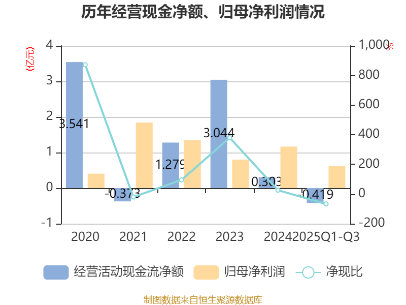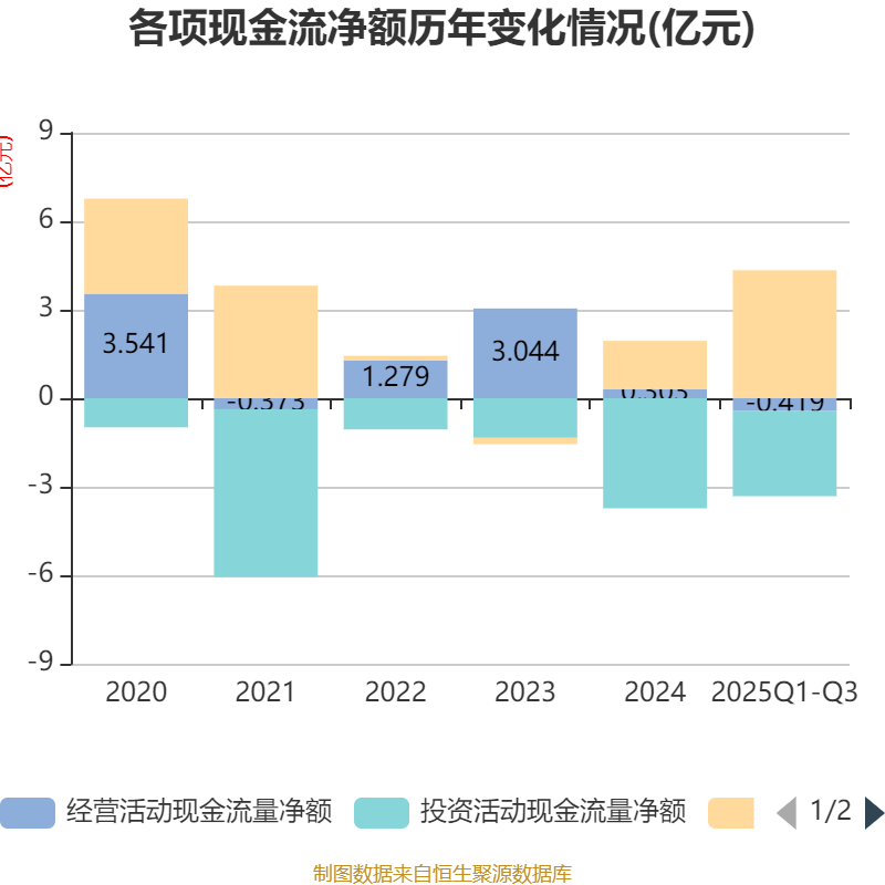 2025年前三季度,公司经营活动现金流净额为-4189.8万元,同比增加5007.95万元;筹资活动现金流净额4.34亿元,同比增加3.71亿元;投资活动现金流净额-2.9亿元,上年同期为-2.96亿元。