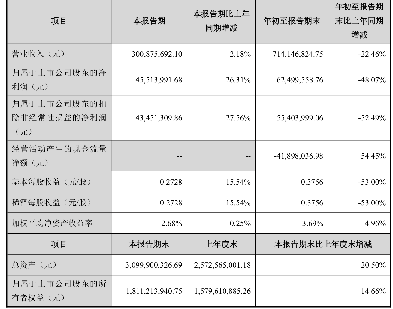 中证智能财讯耐普矿机(300818)10月24日披露2025年第三季度报告。前三季度公司实现营业总收入7.14亿元,同比下降22.46%;归母净利润6249.96万元,同比下降48.07%;扣非净利润5540.4万元,同比下降52.49%;经营活动产生的现金流量净额为-4189.8万元,上年同期为-9197.75万元;报告期内,耐普矿机基本每股收益为0.3756元,加权平均净资产收益率为3.69%。