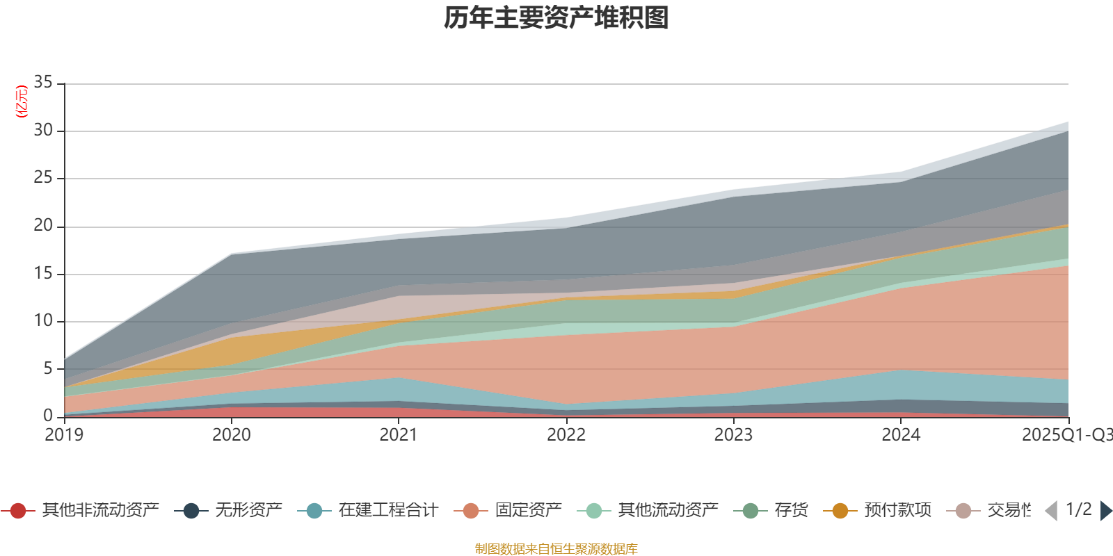 资产重大变化方面,截至2025年三季度末,公司固定资产较上年末增加39.78%,占公司总资产比重上升5.33个百分点;在建工程合计较上年末减少19.98%,占公司总资产比重下降4.05个百分点;应收票据及应收账款较上年末增加44.4%,占公司总资产比重上升1.93个百分点;其他非流动资产较上年末减少90.06%,占公司总资产比重下降1.69个百分点。