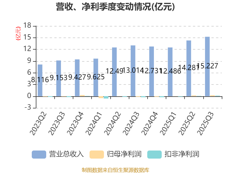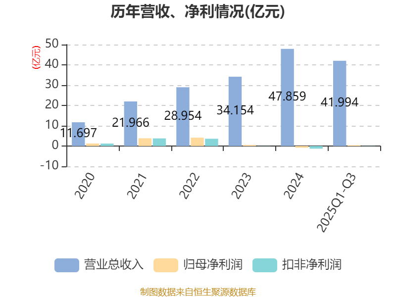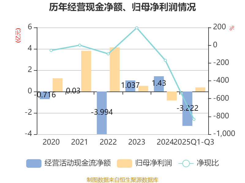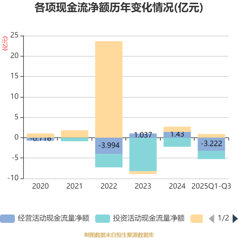 2025年前三季度,公司经营活动现金流净额为-3.22亿元,同比增加4821.99万元;筹资活动现金流净额9059.17万元,同比减少1.31亿元;投资活动现金流净额-2.02亿元,上年同期为-2.15亿元。