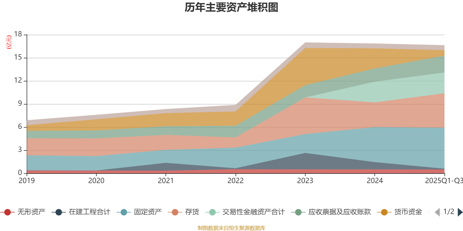 资产重大变化方面,截至2025年三季度末,公司货币资金较上年末减少72.46%,占公司总资产比重下降11.15个百分点;存货较上年末增加38.86%,占公司总资产比重上升7.75个百分点;固定资产较上年末增加17.29%,占公司总资产比重上升5.07个百分点;在建工程合计较上年末减少88.98%,占公司总资产比重下降5.04个百分点。