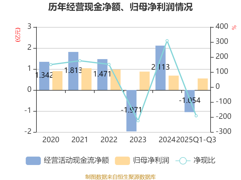 2025年前三季度,公司经营活动现金流净额为-1.05亿元,同比减少2.74亿元;筹资活动现金流净额-6946.05万元,同比增加1590.88万元;投资活动现金流净额-1395.46万元,上年同期为-4.26亿元。