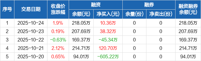 融资方面,当日融资买入268.52万元,融资偿还258.16万元,融资净买入10.36万元。融券方面,融券卖出0份,融券偿还0份,融券余量0份,融券余额0元。融资融券余额合计218.05万元。