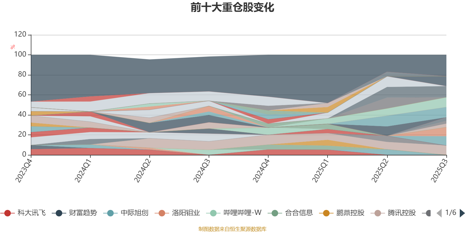 该基金持股集中度较高。截至2025年三季度末,基金十大重仓股分别是华虹半导体、中芯国际、九方智投控股、阿里巴巴-W、腾讯控股、指南针、寒武纪、同花顺、伟创电气、完美世界。