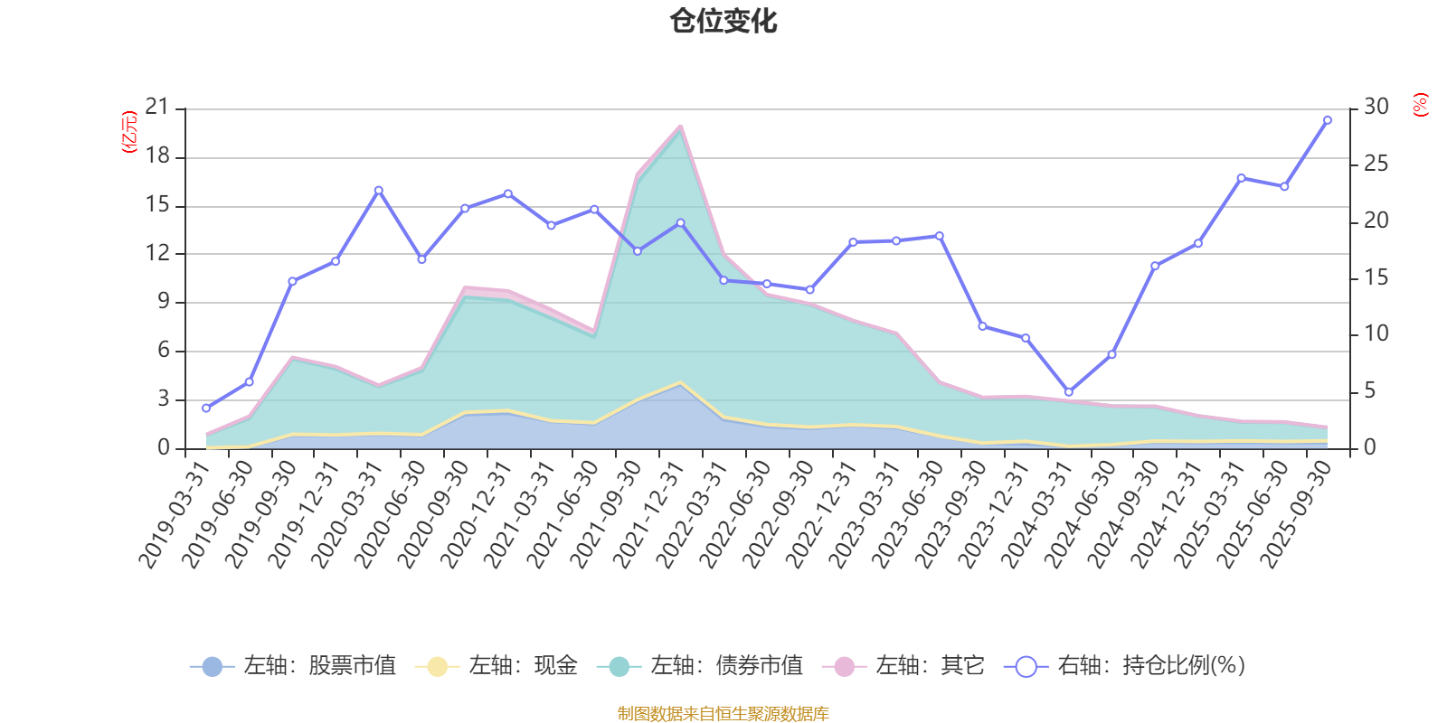 据定期报告数据统计,近三年平均股票仓位为16.61%,同类平均为19.03%。2025年三季度末基金达到28.97%的最高仓位,2019年一季度末最低,为3.58%。
