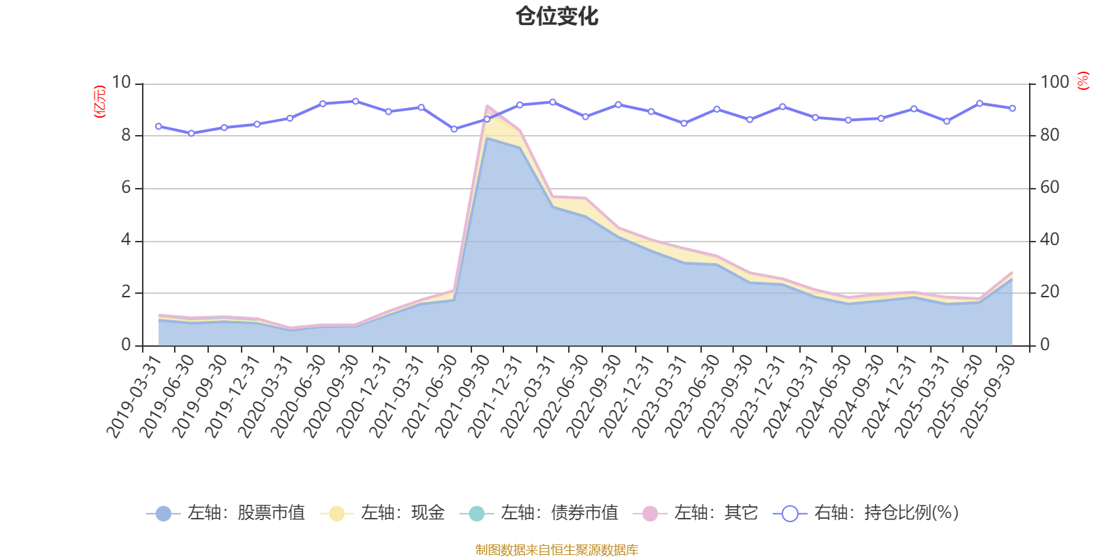 据定期报告数据统计,近三年平均股票仓位为88.38%,同类平均为85.51%。2020年三季度末基金达到93.26%的最高仓位,2019年上半年末最低,为81.03%。