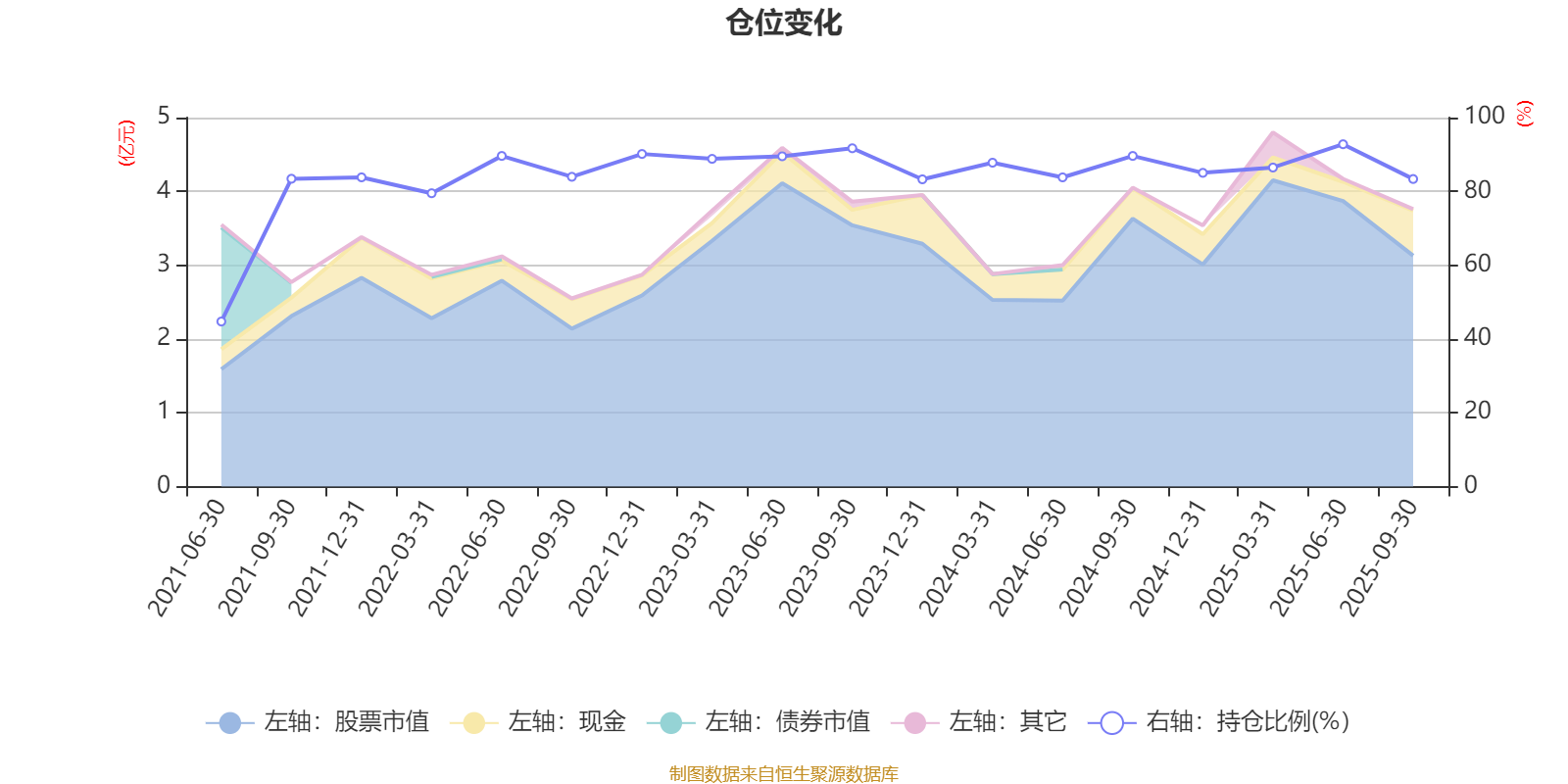 据定期报告数据统计,近三年平均股票仓位为87.69%,同类平均为88.21%。2025年上半年末基金达到92.78%的最高仓位,2021年上半年末最低,为44.73%。