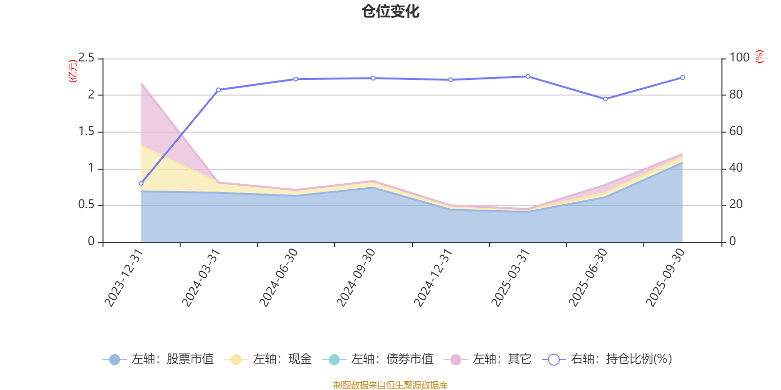 据定期报告数据统计,成立以来平均股票仓位为79.9%,同类平均为83.5%。2025年一季度末基金达到90.22%的最高仓位,2023年末最低,为32.03%。