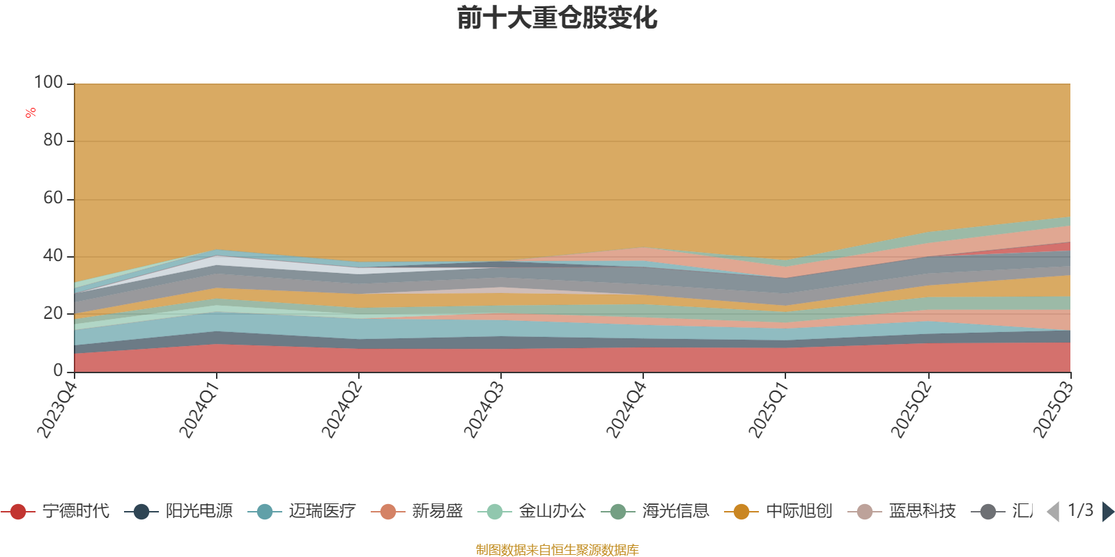 截至2025年三季度末,基金十大重仓股分别是宁德时代、中际旭创、新易盛、寒武纪、中芯国际、海光信息、阳光电源、汇川技术、澜起科技、胜宏科技。