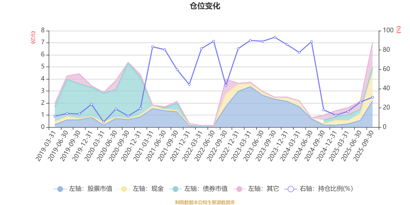 据定期报告数据统计,近三年平均股票仓位为59.14%,同类平均为72.16%。2023年三季度末基金达到93.24%的最高仓位,2020年一季度末最低,为5.44%。
