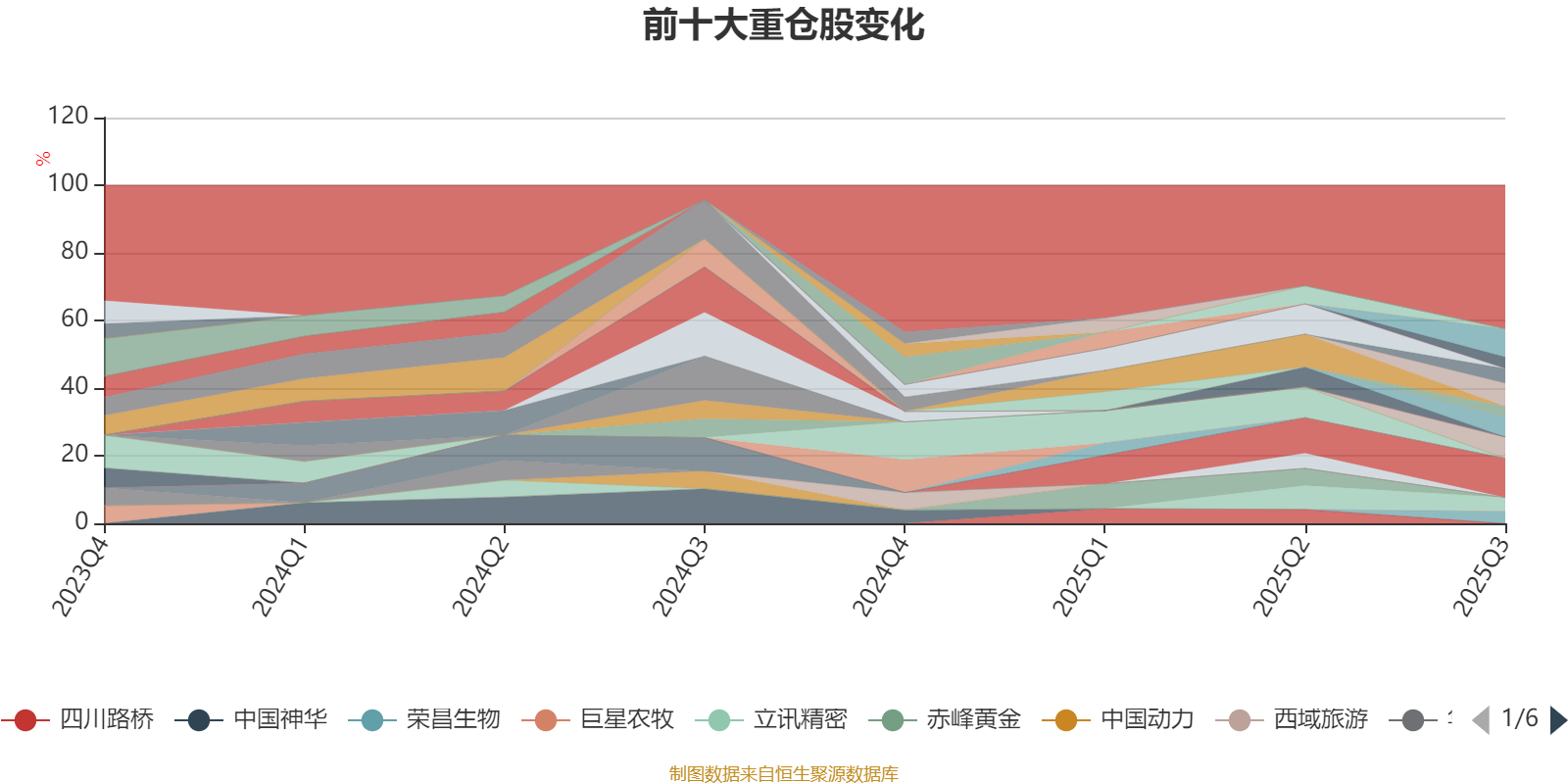 该基金持股集中度较高。截至2025年三季度末,基金十大重仓股分别是海大集团、亿纬锂能、中芯国际、京新药业、寒武纪、浙江荣泰、立讯精密、荣昌生物、中科曙光、新时达。