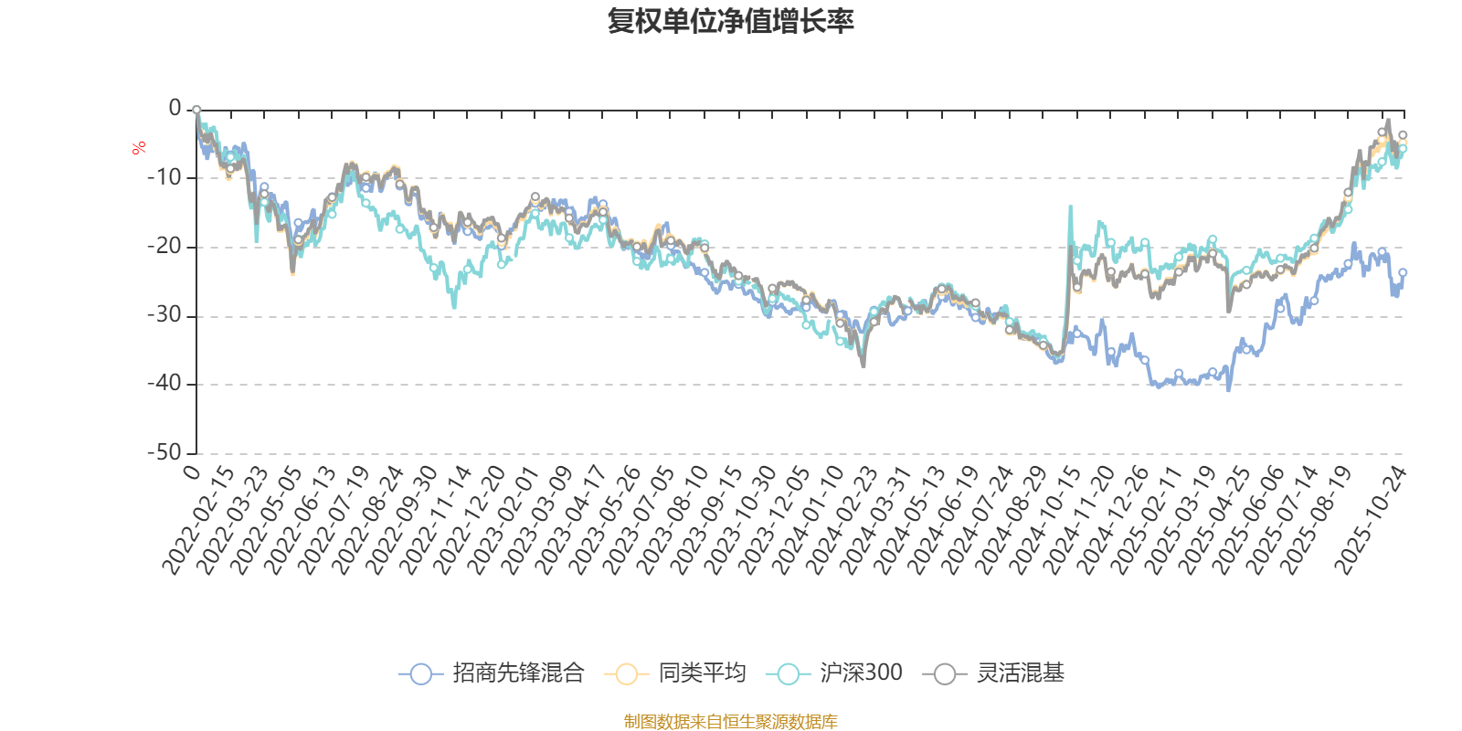 截至10月24日,招商先锋混合近三个月复权单位净值增长率为1.37%,位于同类可比基金1128/1287;近半年复权单位净值增长率为15.68%,位于同类可比基金858/1287;近一年复权单位净值增长率为14.00%,位于同类可比基金843/1287;近三年复权单位净值增长率为-6.85%,位于同类可比基金1080/1286。