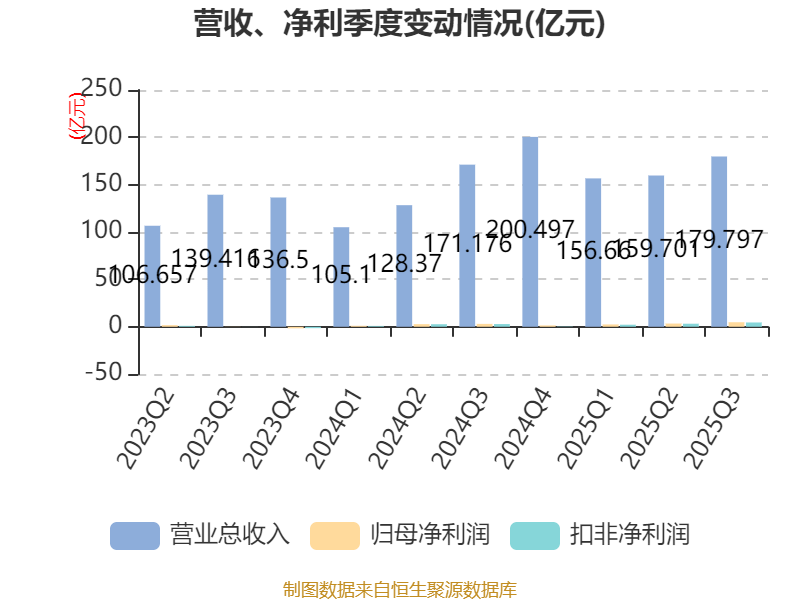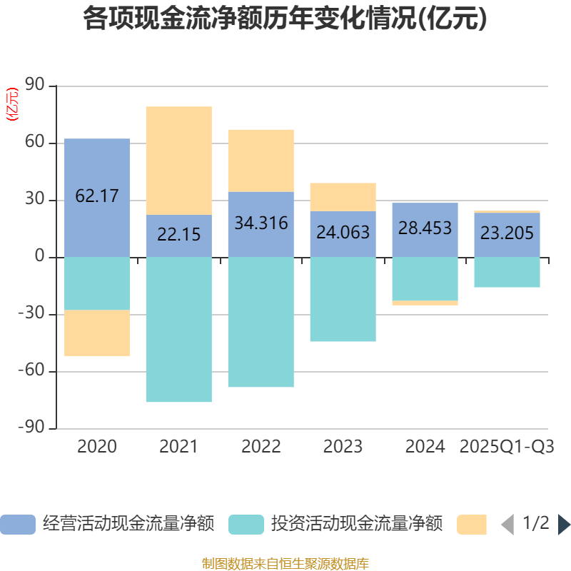 2025年前三季度,公司经营活动现金流净额为23.2亿元,同比增长58.21%;筹资活动现金流净额1.11亿元,同比减少6.89亿元;投资活动现金流净额-15.95亿元,上年同期为-16.75亿元。