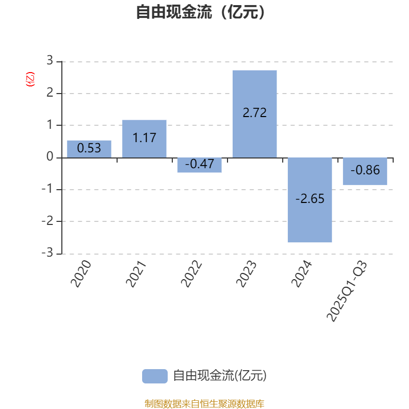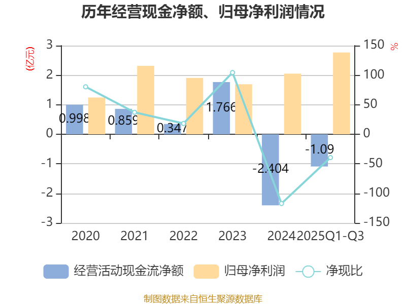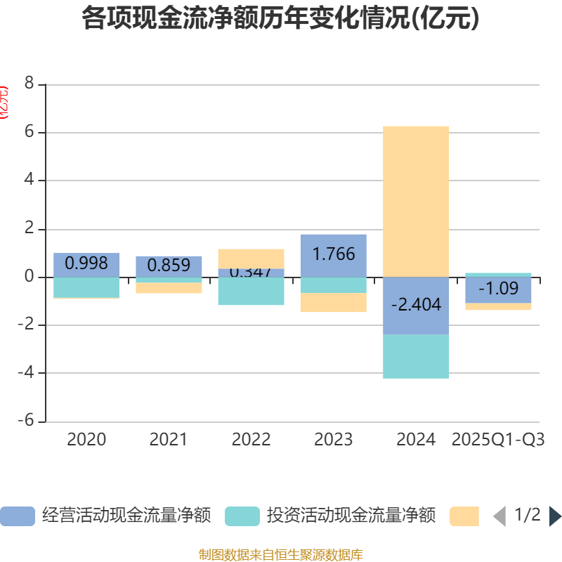 2025年前三季度,公司经营活动现金流净额为-1.09亿元,同比减少5025.1万元;筹资活动现金流净额-2772.29万元,同比减少7.43亿元;投资活动现金流净额1678.95万元,上年同期为-4785.41万元。