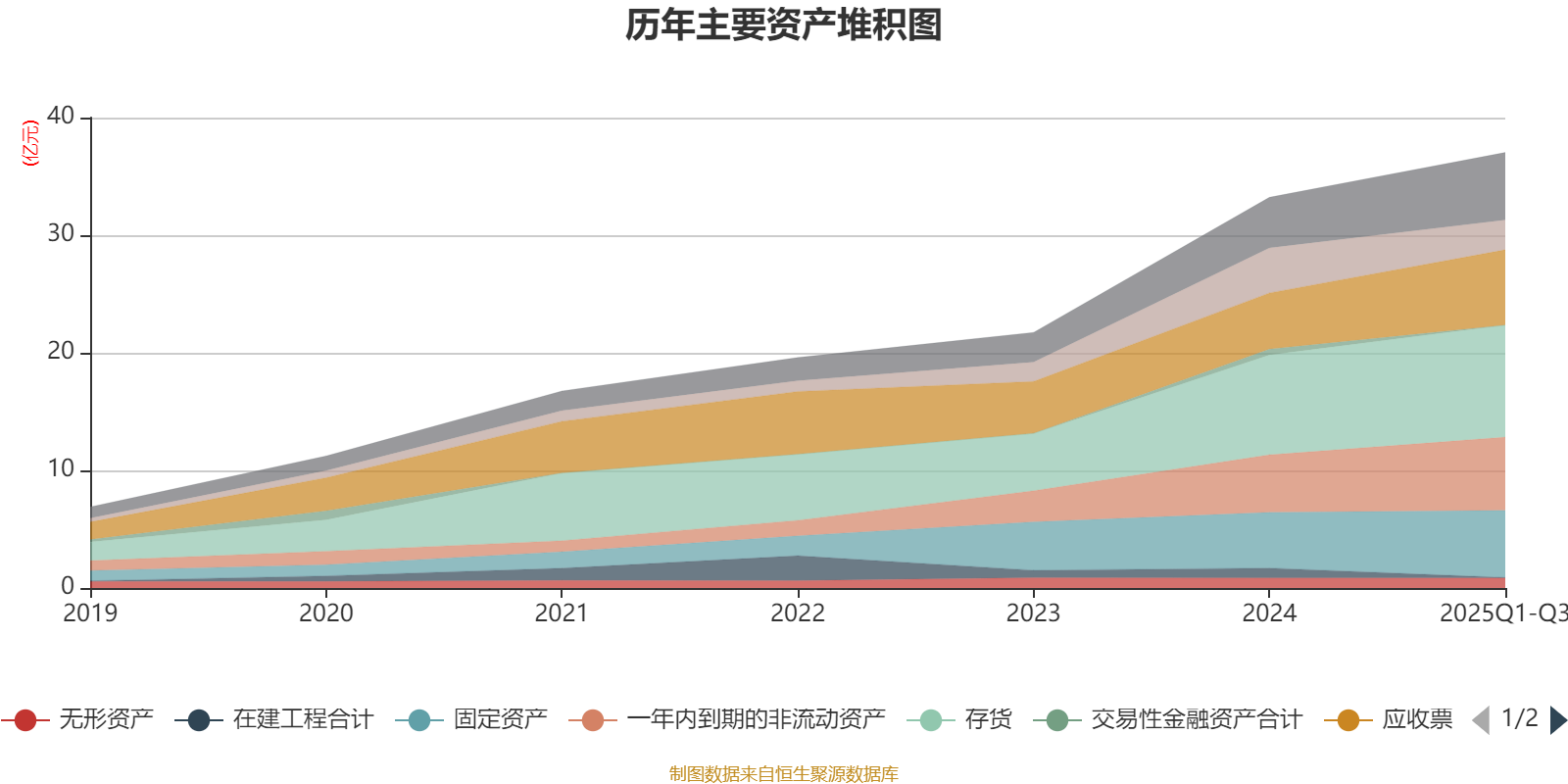 资产重大变化方面,截至2025年三季度末,公司货币资金较上年末减少33.81%,占公司总资产比重下降4.67个百分点;应收票据及应收账款较上年末增加34.29%,占公司总资产比重上升2.94个百分点;在建工程合计较上年末减少95.07%,占公司总资产比重下降2.41个百分点;应收款项融资较上年末增加242.91%,占公司总资产比重上升2.13个百分点。