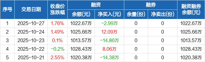 融资方面,当日融资买入56.86万元,融资偿还59.85万元,融资净偿还2.99万元。融券方面,融券卖出0份,融券偿还0份,融券余量0份,融券余额0元。融资融券余额合计1022.67万元。