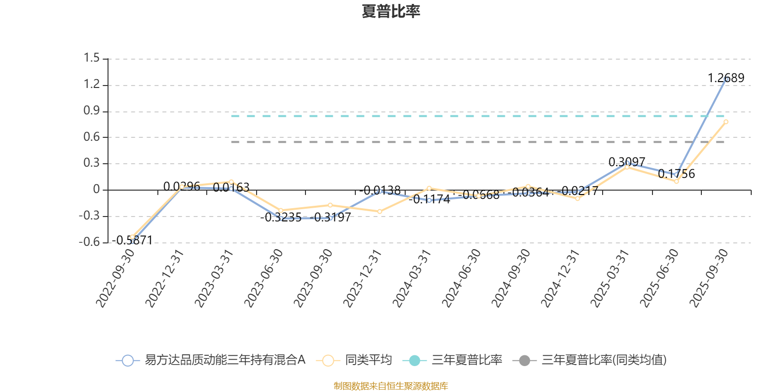 截至9月30日,基金近三年夏普比率为0.8448,位于同类可比基金5/20。