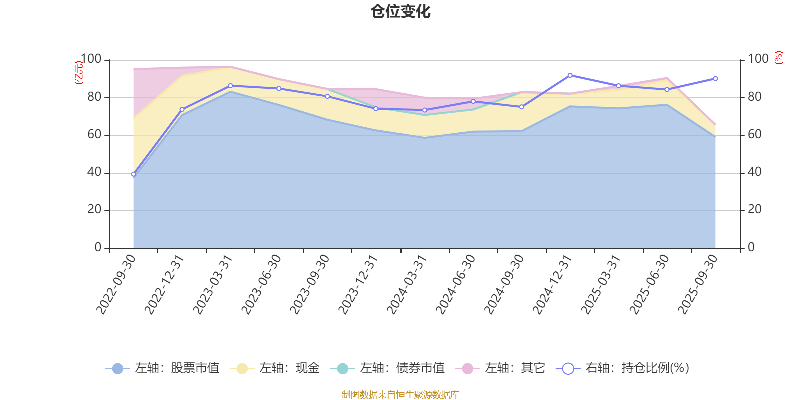 据定期报告数据统计,近三年平均股票仓位为81.46%,同类平均为86.79%。2024年末基金达到91.75%的最高仓位,2022年三季度末最低,为39.26%。
