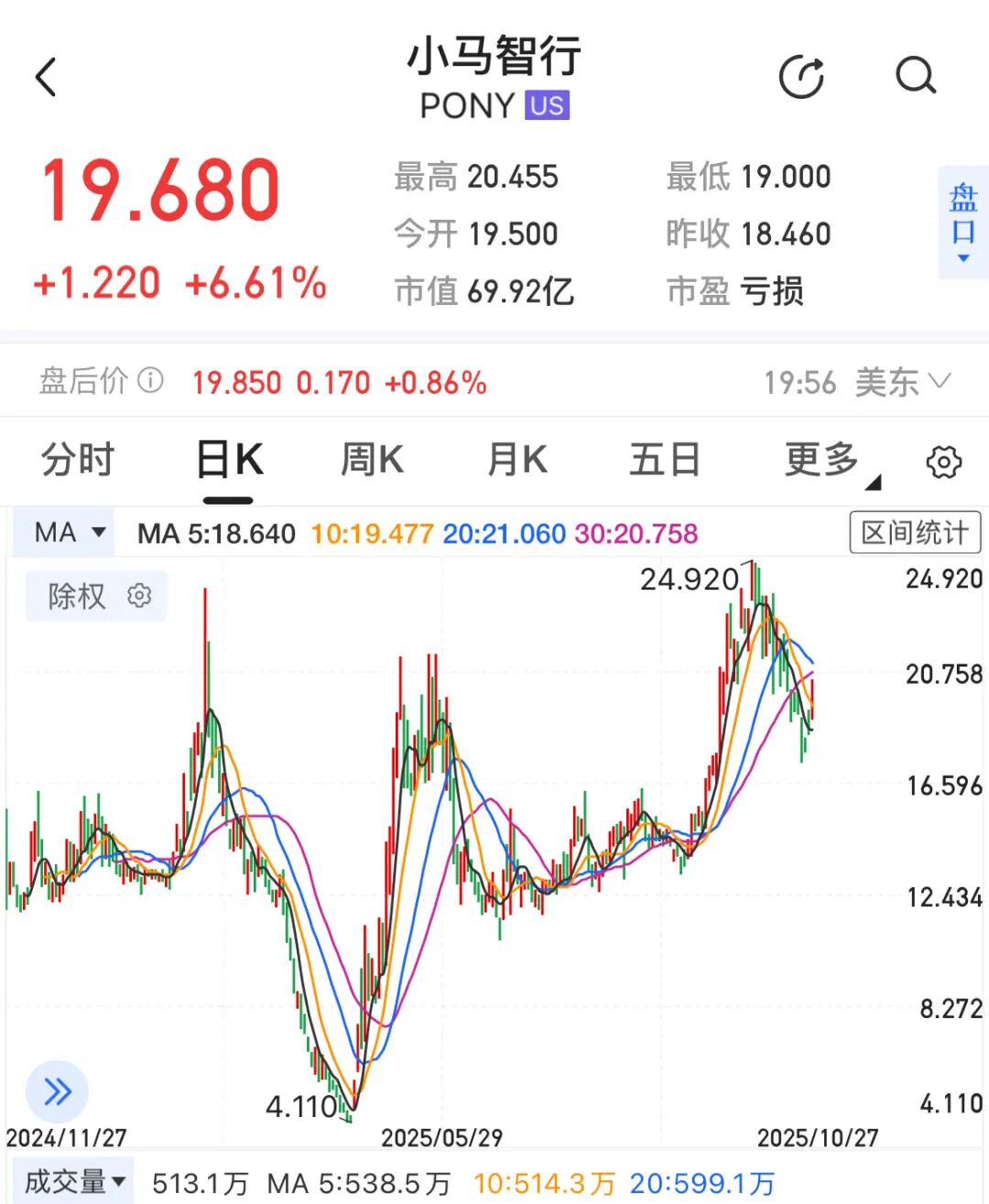 自美股上市以来,小马智行在公开市场吸引了包括柏基投资(Baillie Gifford)、公爵资本(Baron Capital)、方舟投资(ARK Invest)、威灵顿资产管理(Wellington Management)、富达投资(Fidelity Management & Research)在内的多家知名机构积极买入。美东时间10月27日,小马智行收盘价报19.68美元,并已显著超越其13美元的美股IPO发行价。