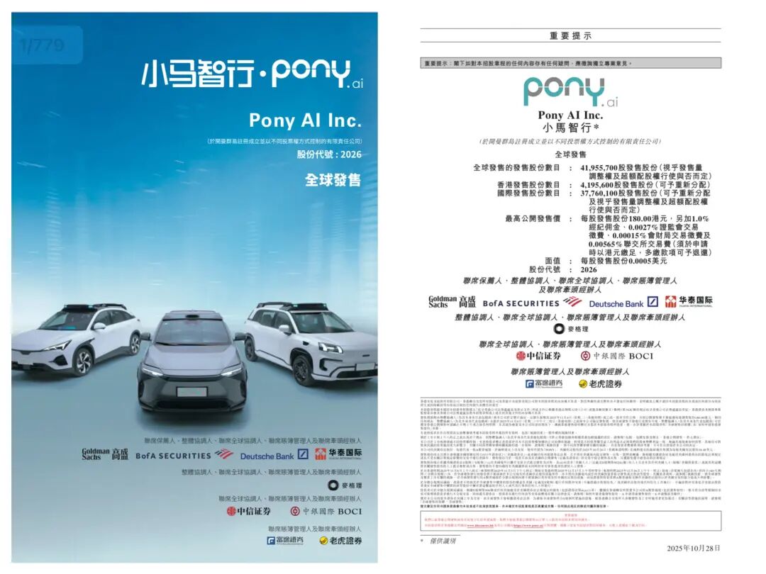 10月28日,中国头部自动驾驶企业小马智行在香港启动招股程序。本次IPO拟发售约4196万股股份,其中香港公开发售约420万股,占比10%,国际配售约3776万股,占比90%,另有15%发售量调整权和15%超额配股权。每股发售价不超过180.00港元,每手100股。