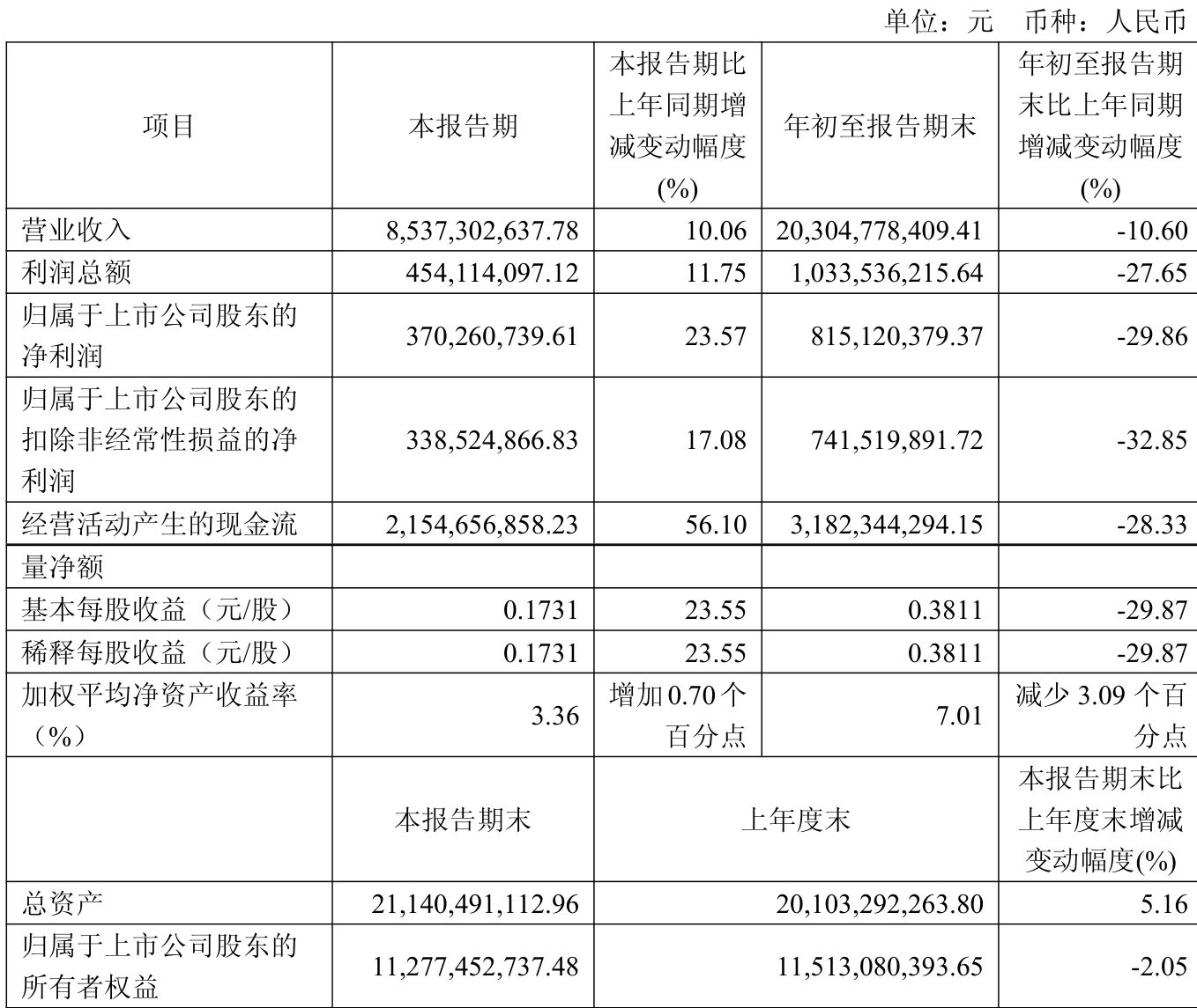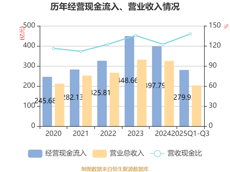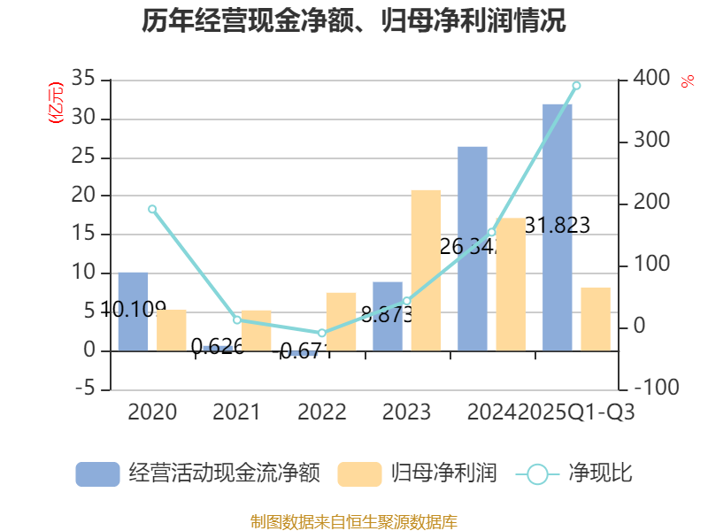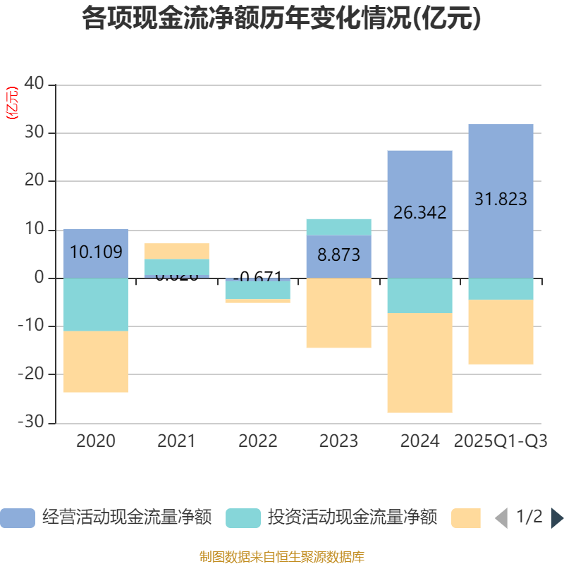 2025年前三季度,公司经营活动现金流净额为31.82亿元,同比下降28.33%;筹资活动现金流净额-13.36亿元,同比增加11.24亿元;投资活动现金流净额-4.52亿元,上年同期为-5.41亿元。