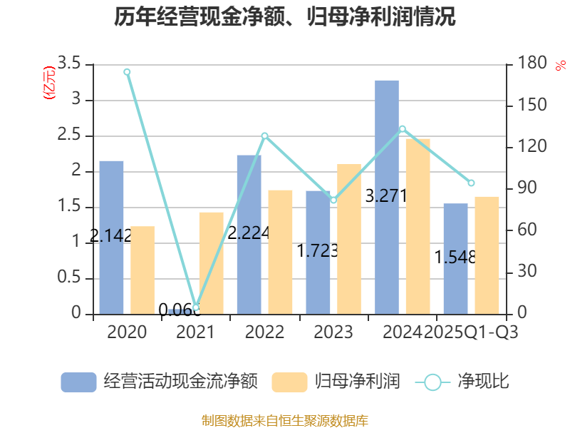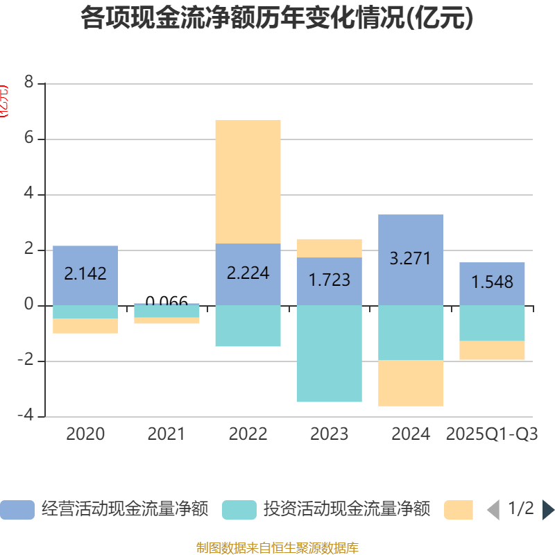 2025年前三季度,公司经营活动现金流净额为1.55亿元,同比下降42.56%;筹资活动现金流净额-6712.85万元,同比增加3915.49万元;投资活动现金流净额-1.29亿元,上年同期为-2.78亿元。