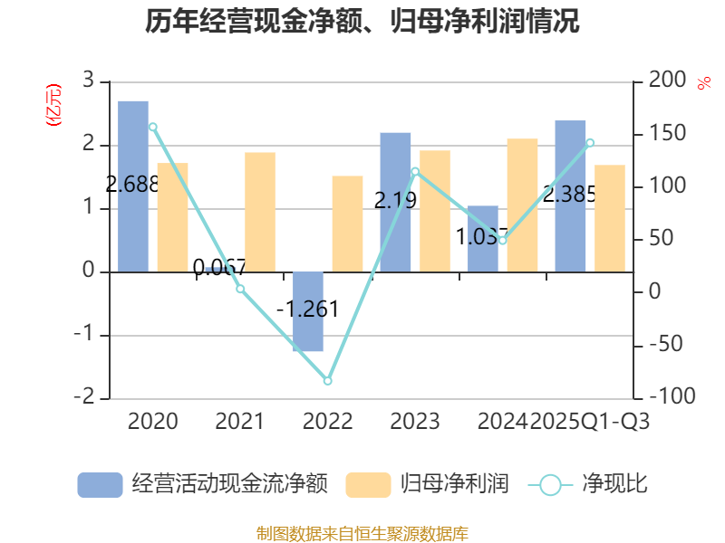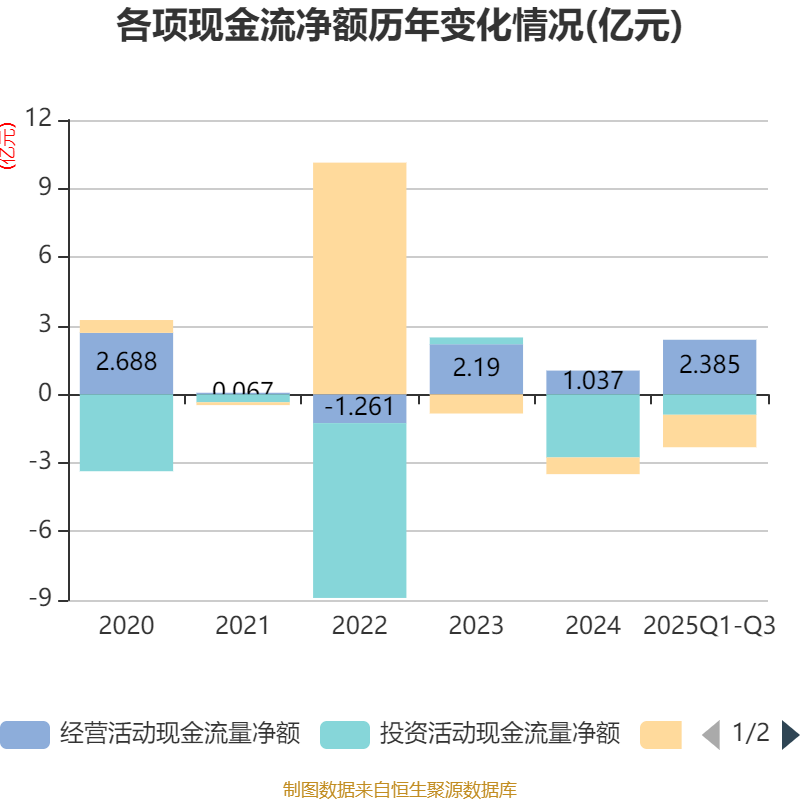 2025年前三季度,公司经营活动现金流净额为2.39亿元,同比增加3.12亿元;筹资活动现金流净额-1.42亿元,同比减少7896.96万元;投资活动现金流净额-8961.37万元,上年同期为-6623.2万元。