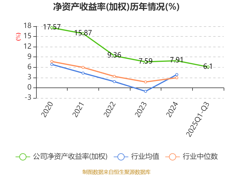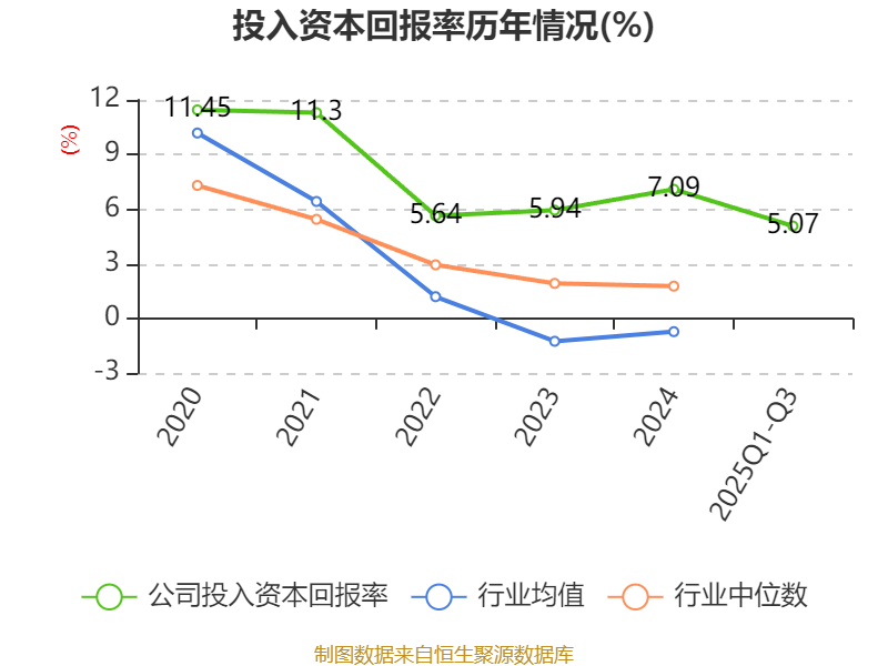 盈利能力方面, 2025年前三季度公司加权平均净资产收益率为6.1%,同比下降0.22个百分点。公司2025年前三季度投入资本回报率为5.07%,较上年同期下降0.15个百分点。