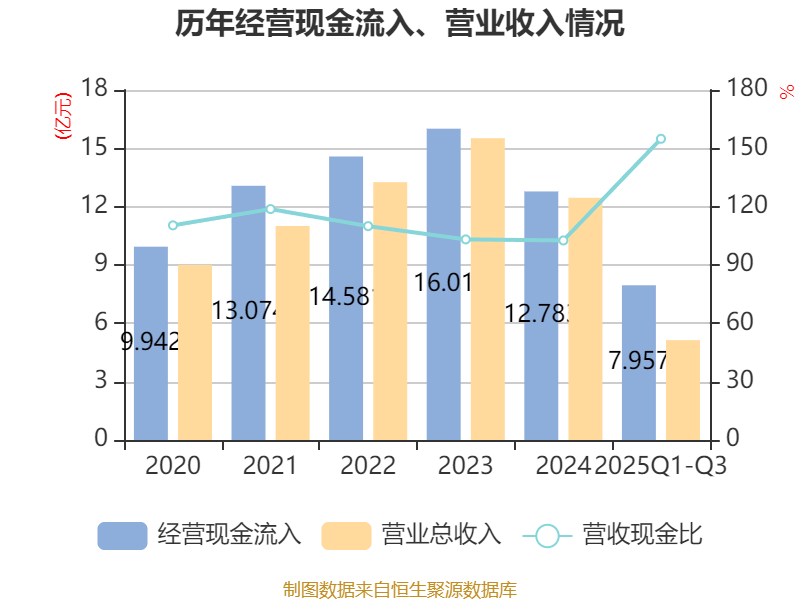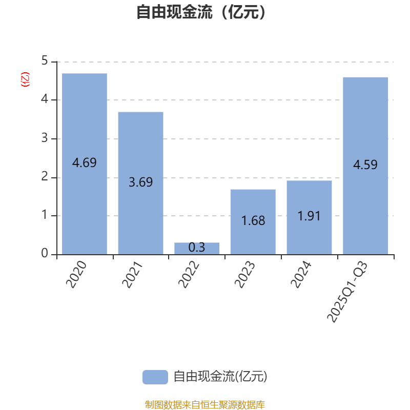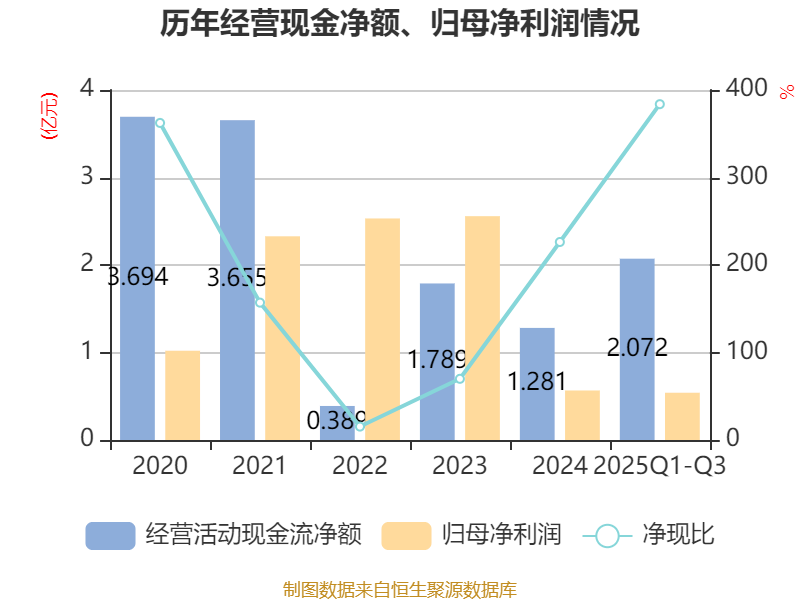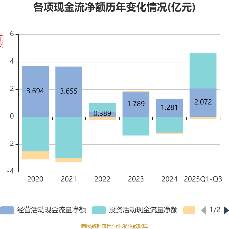 2025年前三季度,公司经营活动现金流净额为2.07亿元,同比增长72.93%;筹资活动现金流净额-1461.56万元,同比减少242.05万元;投资活动现金流净额2.58亿元,上年同期为1.33亿元。