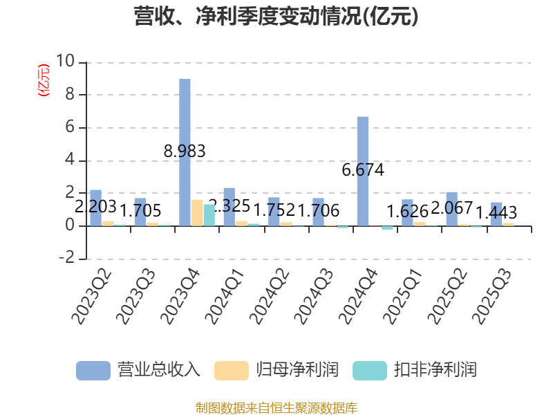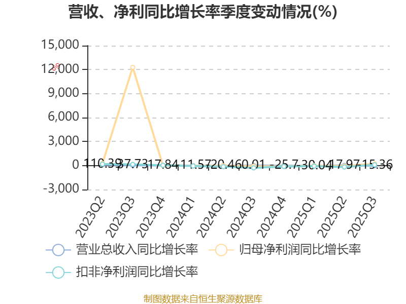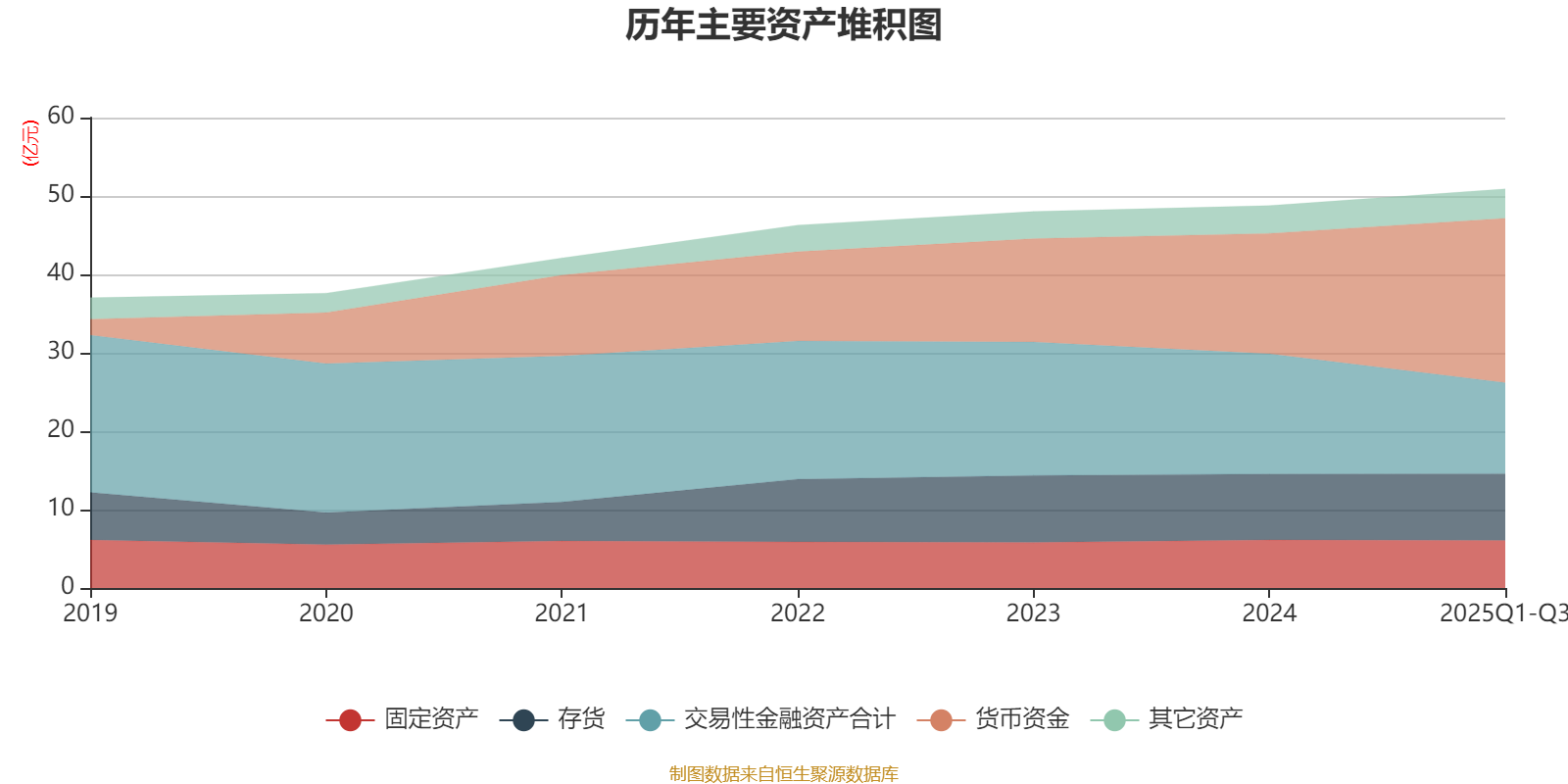 资产重大变化方面,截至2025年三季度末,公司货币资金较上年末增加36.56%,占公司总资产比重上升9.72个百分点;交易性金融资产合计较上年末减少24.3%,占公司总资产比重下降8.62个百分点;预付款项较上年末增加124.42%,占公司总资产比重上升0.8个百分点;固定资产较上年末减少1.16%,占公司总资产比重下降0.66个百分点。