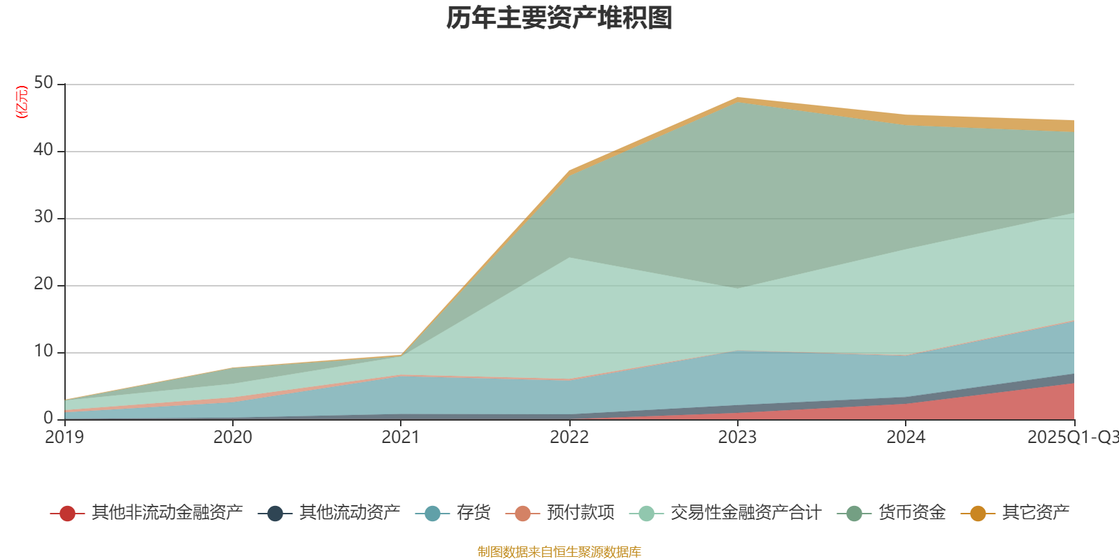 资产重大变化方面,截至2025年三季度末,公司货币资金较上年末减少34.68%,占公司总资产比重下降13.63个百分点;其他非流动金融资产较上年末增加134.13%,占公司总资产比重上升6.99个百分点;存货较上年末增加26.95%,占公司总资产比重上升3.95个百分点;交易性金融资产合计较上年末增加1.51%,占公司总资产比重上升1.18个百分点。