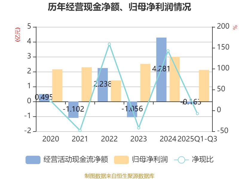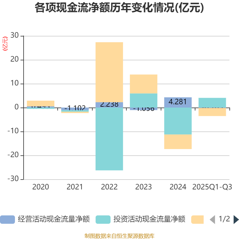2025年前三季度,公司经营活动现金流净额为-1626.52万元,同比减少1.1亿元;筹资活动现金流净额-3.39亿元,同比增加1.5亿元;投资活动现金流净额4.05亿元,上年同期为-9.29亿元。