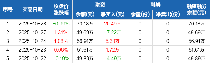 融资方面,当日融资买入23.95万元,融资偿还3.46万元,融资净买入20.49万元。融券方面,融券卖出0份,融券偿还0份,融券余量0份,融券余额0元。融资融券余额合计70.18万元。